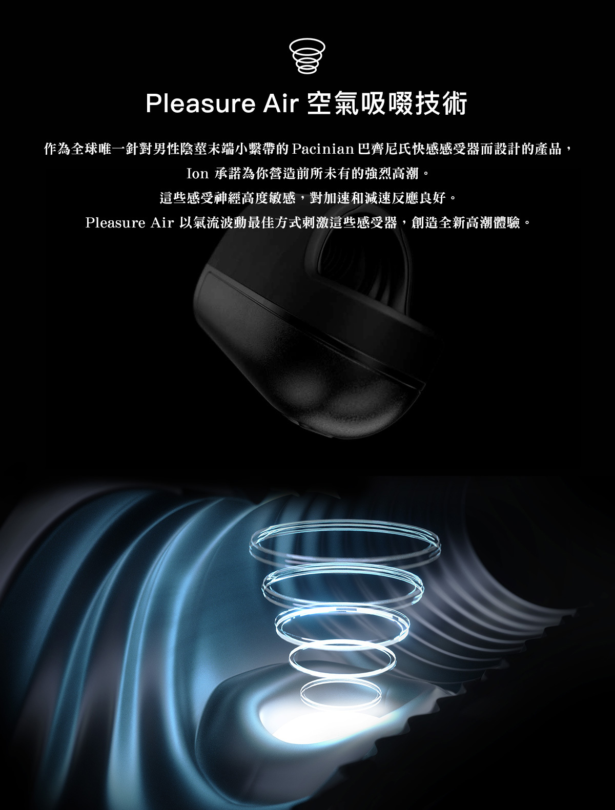 當你膩了活塞玩法,也對震動不感到愉悅,德國柏林的這間情趣設計公司研發出的新技術:「空氣吸淬」,這邊先讓你了解,男性陰莖末端有個稱作「巴齊尼氏小體」的神經末梢感受器,當你刺激這些感受器時,陰莖會有放鬆膨脹緊縮,而達到瞬間與強烈的愉悅感,而氣流震動飛機杯的內緣處,有一個洞口會噴出氣流,而強力的氣流接觸你的陰莖末梢神經時,伴隨你的上下擼動,想像手口並用的快感,與刺驚表面不同,這樣的快感是刺激了敏感的陰莖內神經,而從內向外展延的愉悅感,是你前所未有的體驗。