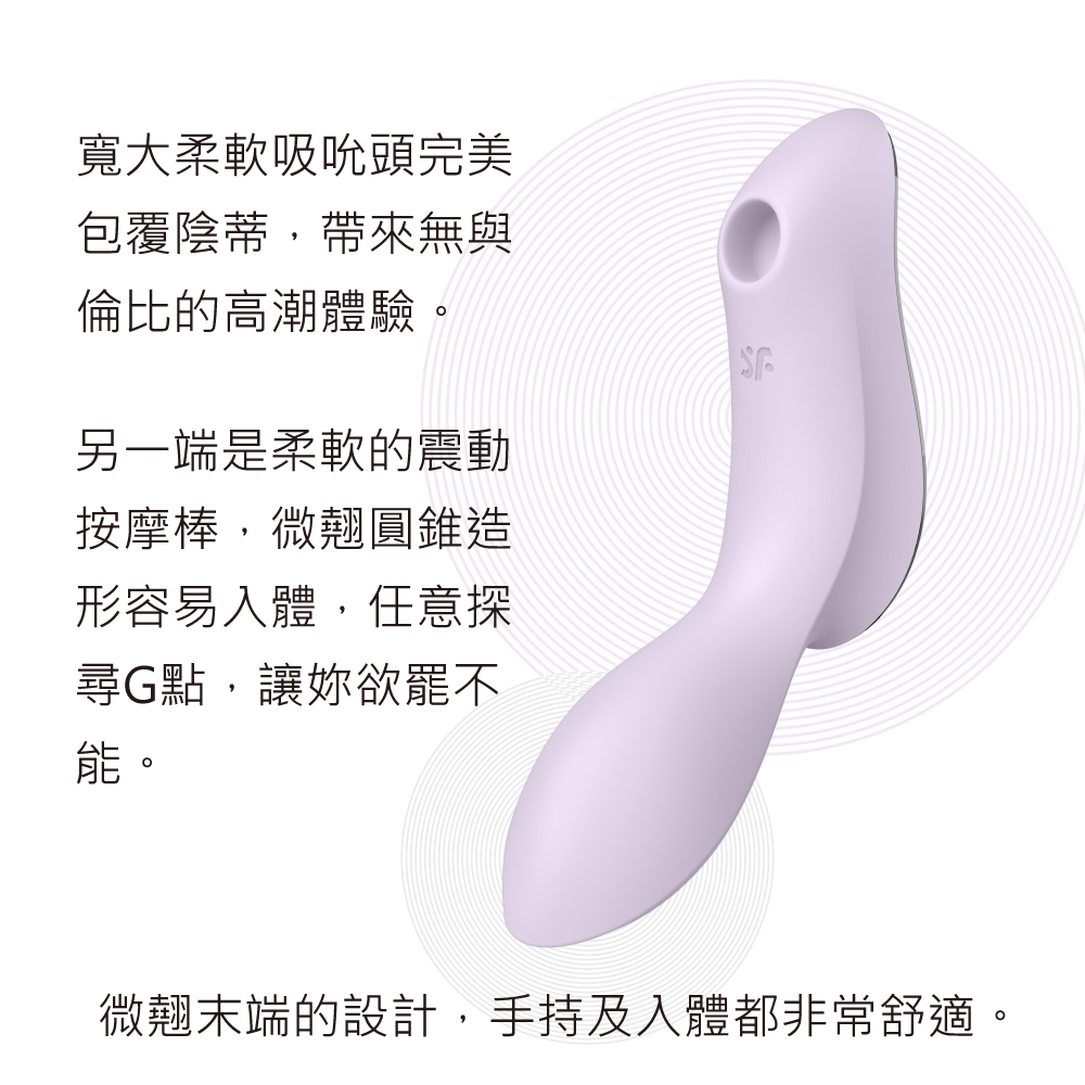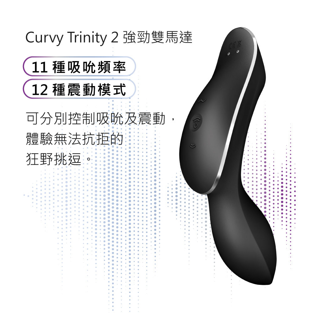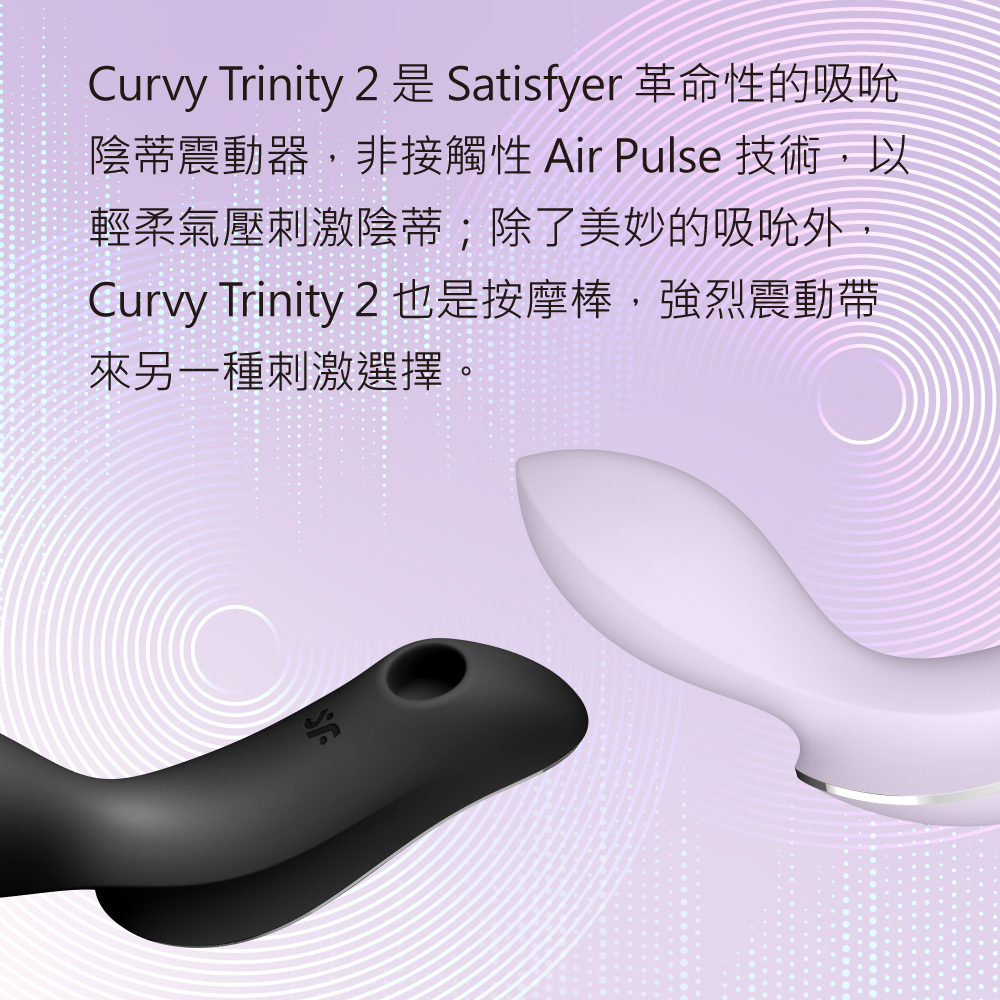 Curvy Trinity 2 是 Satisfyer 革命性的吸吮陰蒂震動器,非接觸性 Air Pulse 技術技術,以輕柔氣壓刺激陰蒂;除了美妙的吸吮外,Curvy Trinity 2 也是按摩棒,強烈震動帶來另一種刺激選擇。