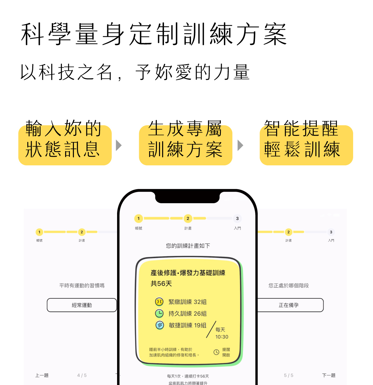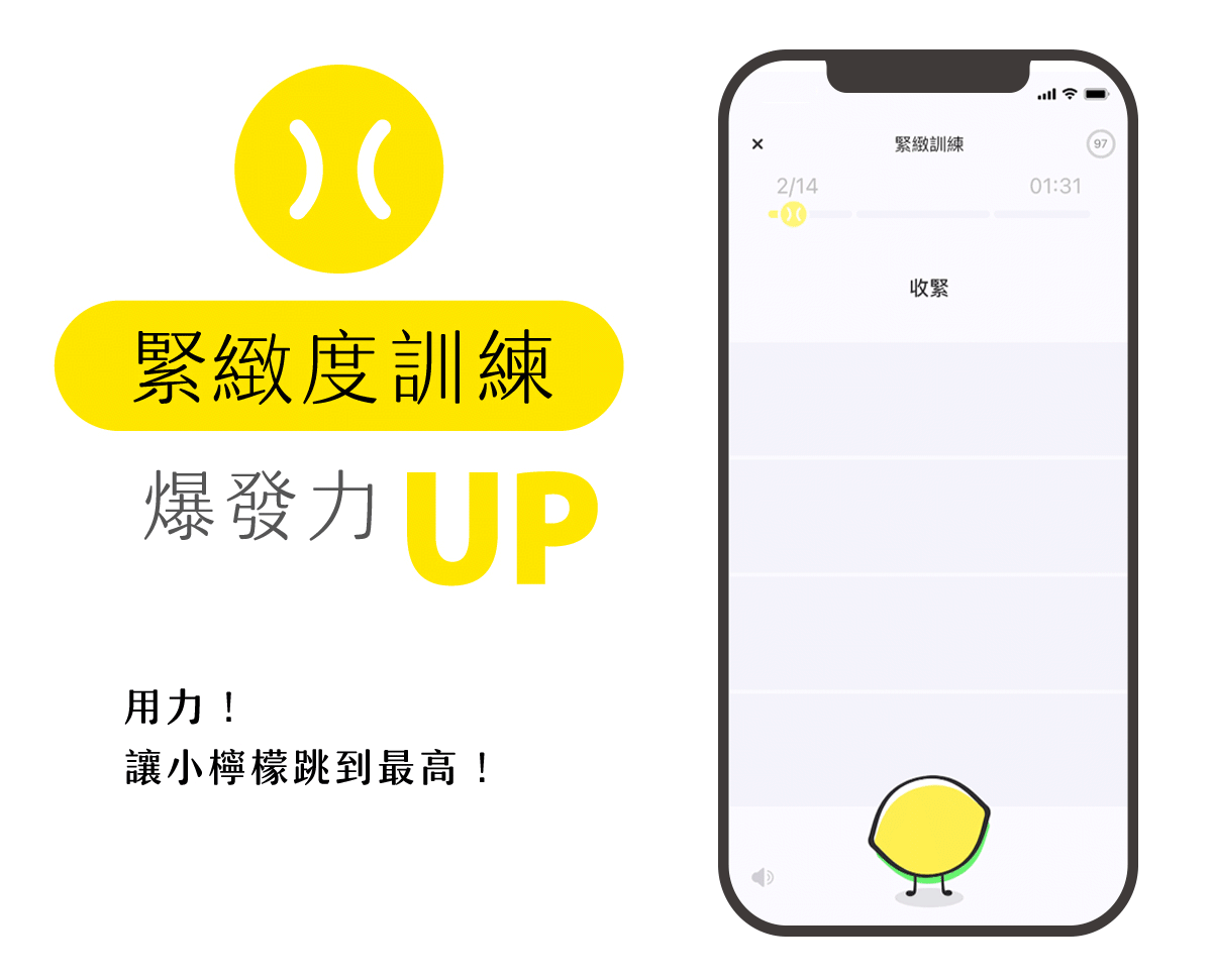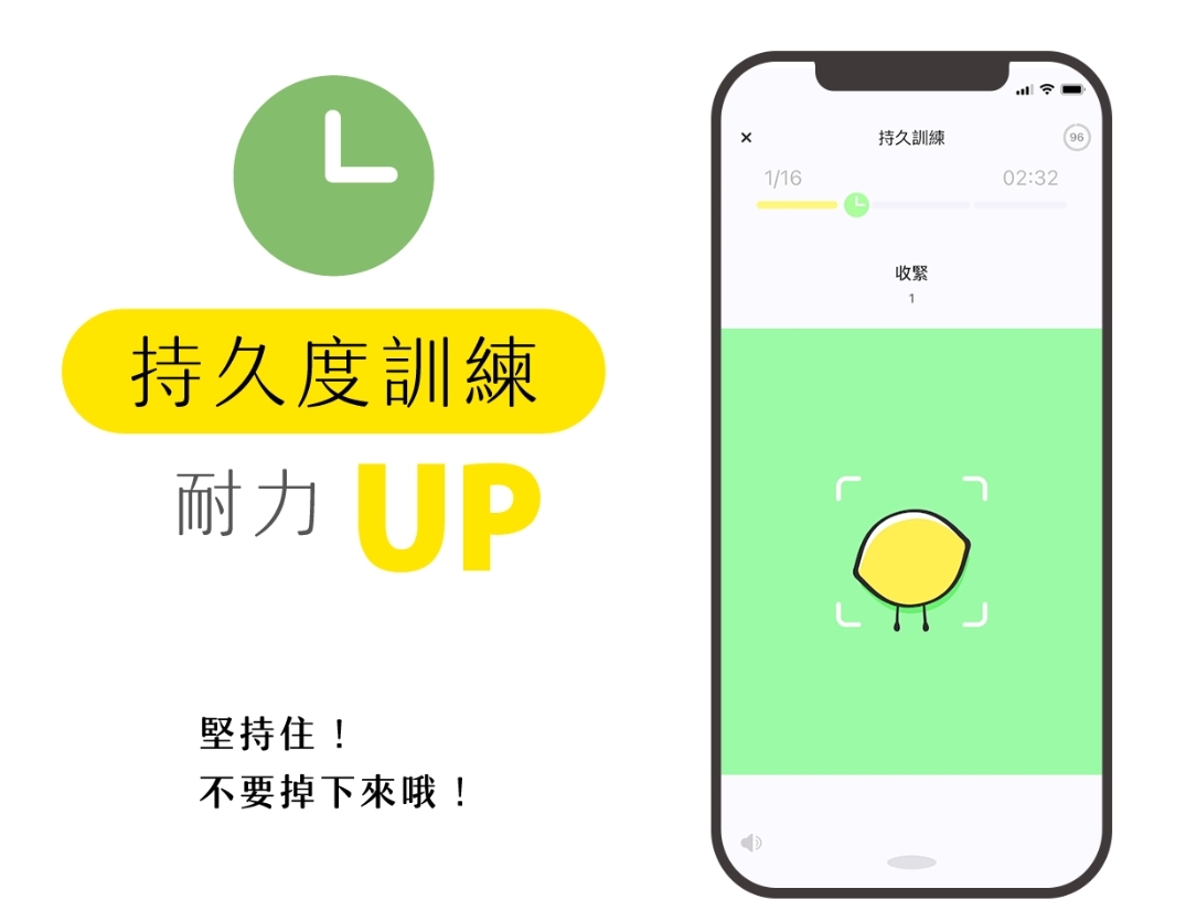 跟著APP一起做,制訂你的訓練計畫,告訴智能訓練師,你現在正處於何種階:備孕?產後?或是一般女性,接著排定訓練步驟,你只需找一個舒服的姿勢、跟著引導,用力、放鬆,記錄你的鍛鍊成果。分別有三項指標:緊緻、持久力、敏捷力。你不需要盲目的訓練,看著詳細的紀錄,讓你訓練更加有效。骨盆底肌的鍛鍊絕對不是嚴肅又可怕的事,像遊戲一樣訓練,聽音樂,花點少許時間,妳值得更好的身體與生活。