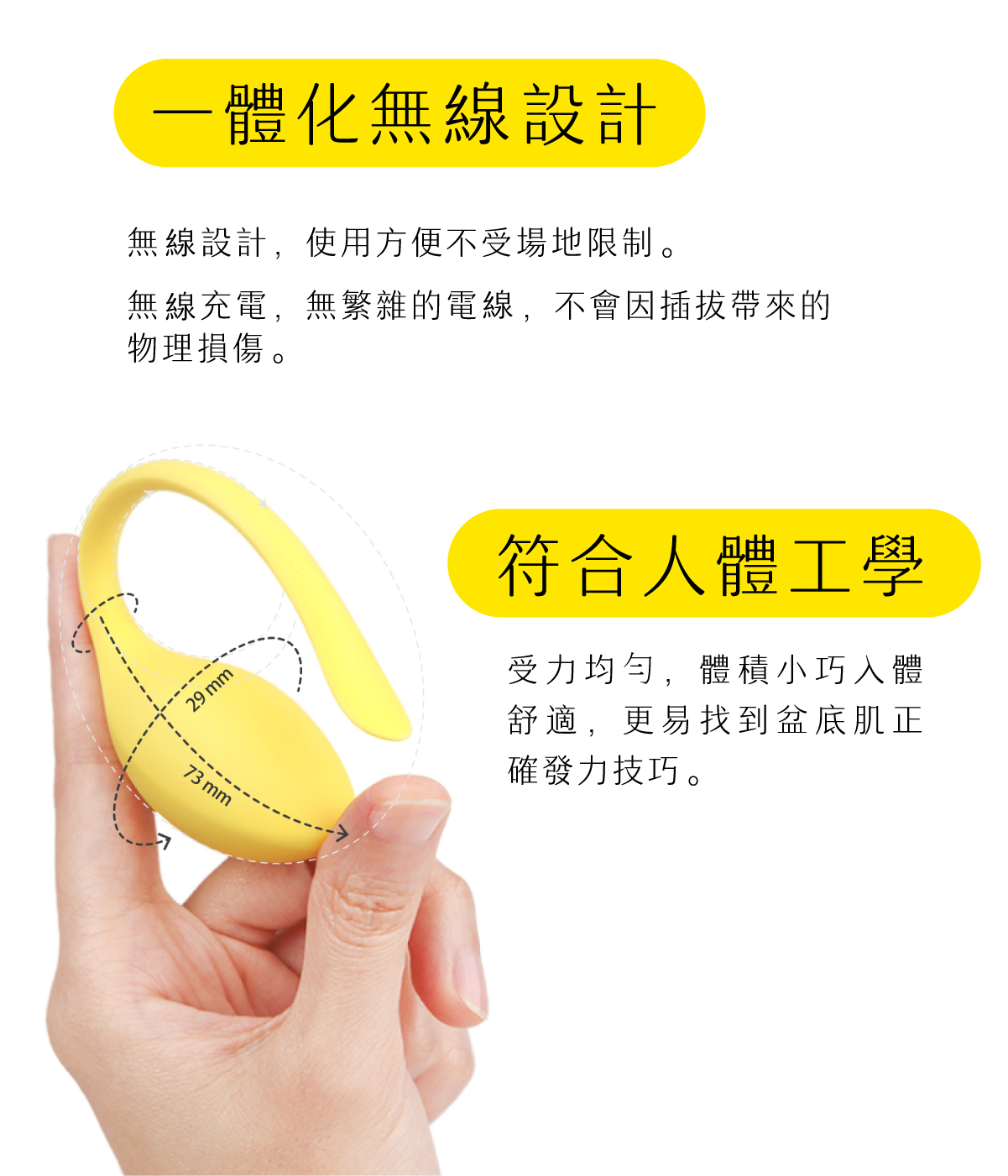 樂檬是一顆一體成型的高科技聰明球,沒有繁雜的的設計,隨時隨地都能使用,出遊、健身、上班、在家,無線的設計,讓你方便使用。7.3公分x2.9公分,體積小方便進入陰道,不會感到不適,樂檬的設計讓你受力均勻,跟著引導,你會更正確找到施力技巧。防水防塵方便清洗,泌尿科醫師與院長的專業推薦,樂檬有著許多使用者的讚賞。
