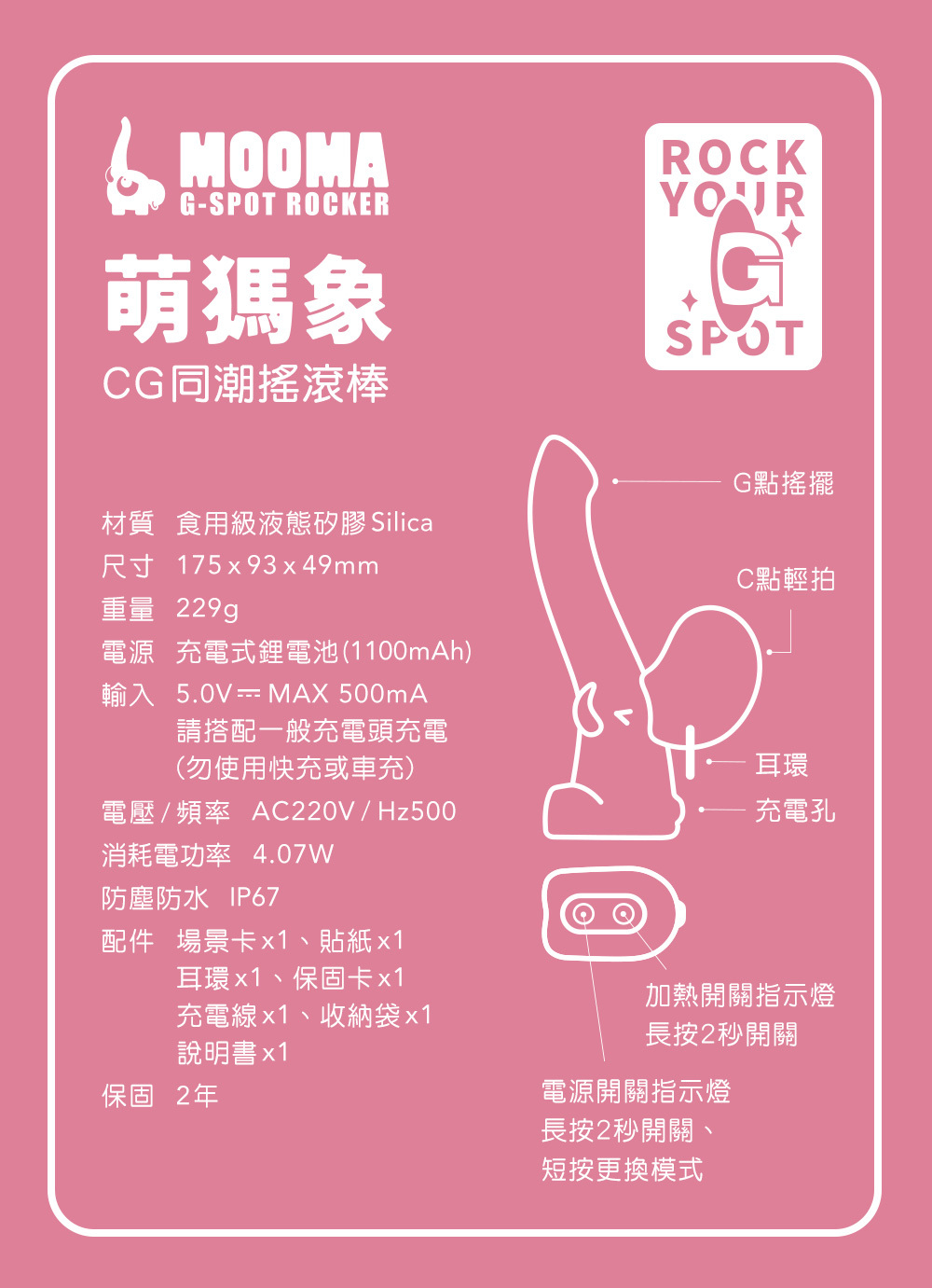 萌瑪象用的是極軟的矽膠,除了碰觸舒適外,頂多到象鼻頭有個軟墊,讓你深入私處時不會感到不適,八種震動模式。象鼻上翹的設計為的是更好碰觸G點,而G點大多在陰道口3-4公分處,當然因人而異,有的人在兩端或是下面,所以萌瑪象設計了旋轉的象鼻,讓進入陰道的萌瑪象可以每一處都觸碰到,而旋轉的觸感也讓震動更加有舒服,陰道壁的所有敏感帶都能碰到,萌瑪象給你的不只情趣,還有最佳體驗。
