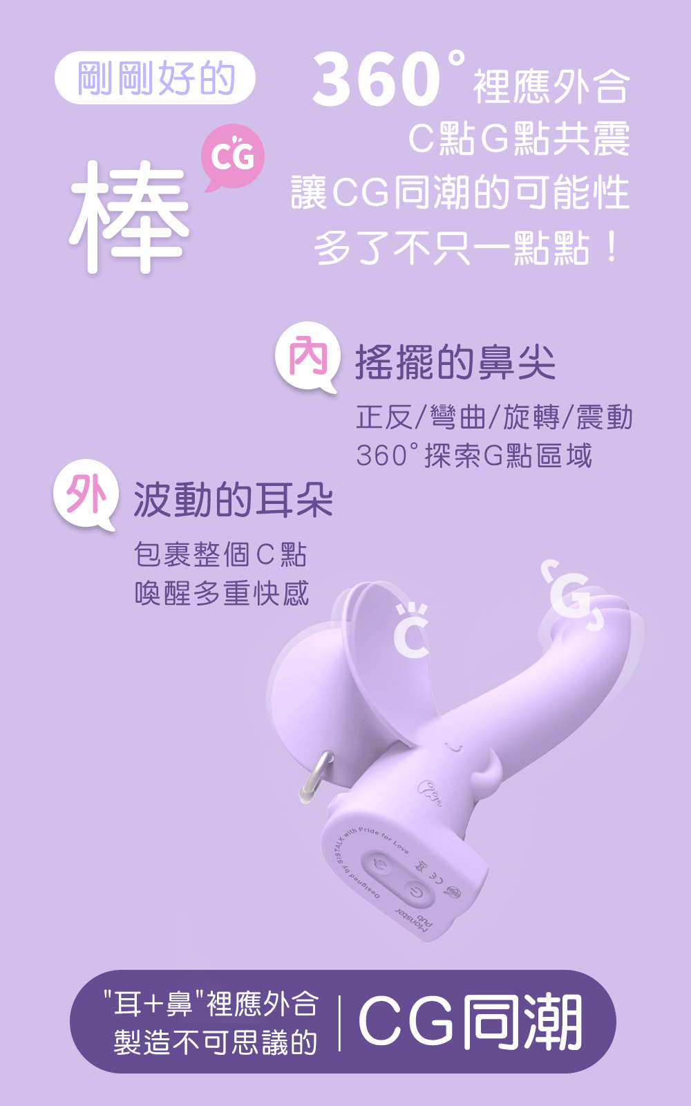 我們一再強調,C點也就是陰蒂是女性最容易觸發高潮的地方,若你沒有陰道高潮,但你絕對會有陰蒂高潮,透過陰蒂高潮可能觸發深處的陰道高潮。萌瑪象的雙耳的震動可以碰觸陰唇到陰蒂的部位,雙耳的邊緣從細往下到寬,觸感舒適,傳震效果很好,雙邊的震動比起單點,更加有感。