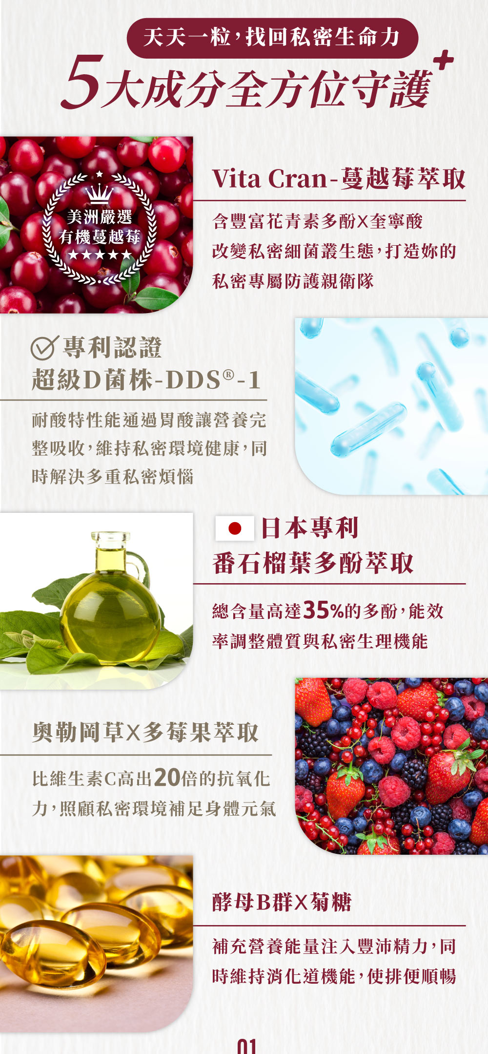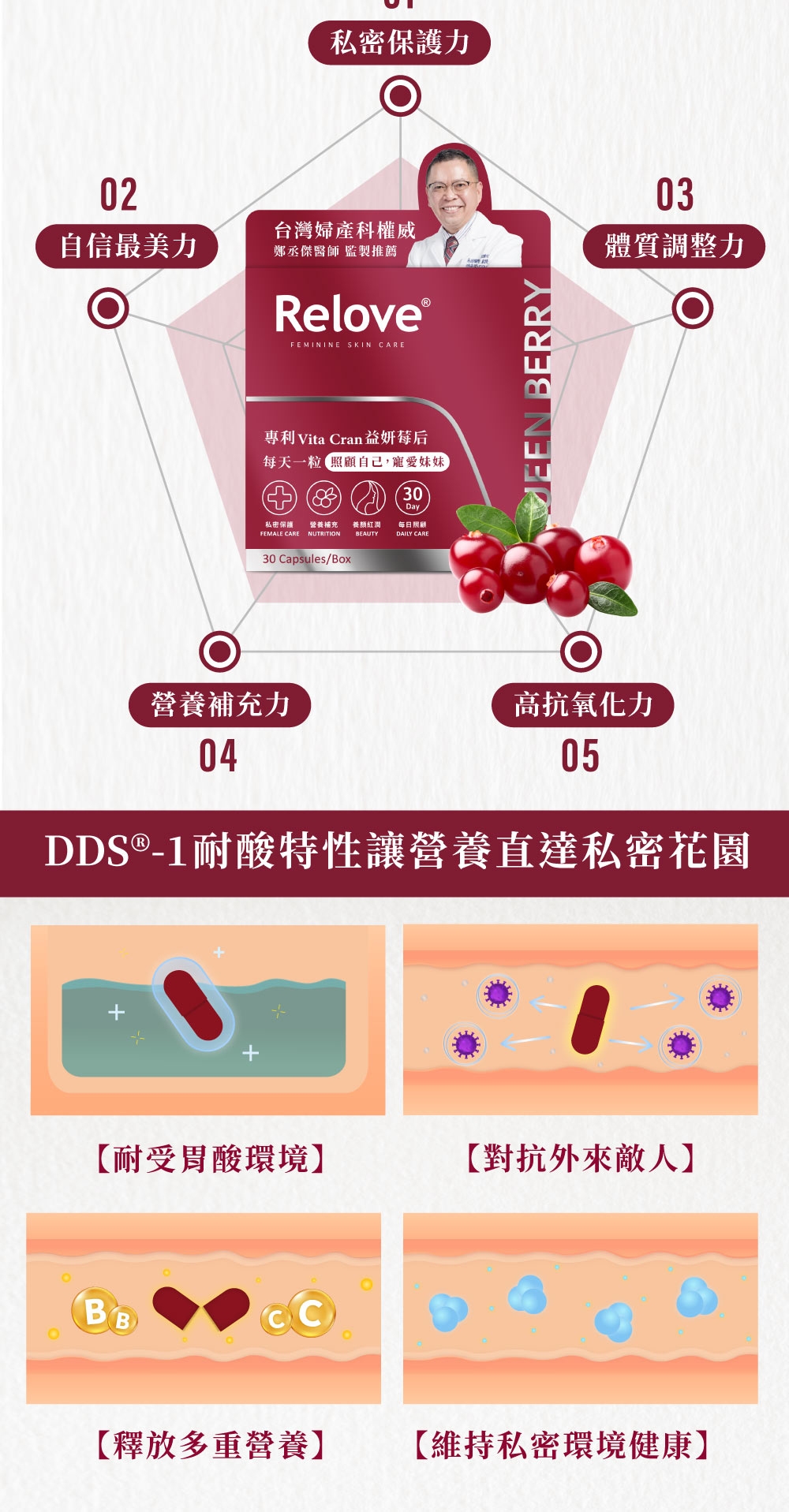 含有高單位的蔓越莓萃取以及青花素萃取,並且擁有耐酸特性,可以保持完整地通過腸胃,把營養素釋放出來維持私密花園健康!
