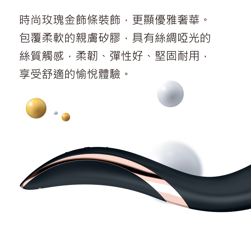 時尚玫瑰金飾條裝飾,更顯優雅奢華。包覆柔軟的親膚矽膠,具有絲綢啞光的絲質觸感,柔韌、彈性好、堅固耐用,享受舒適的愉悅體驗。人體工學設計專為女性輪廓量身打造,纖細平滑好入體,任意探尋G點,讓妳欲罷不能。