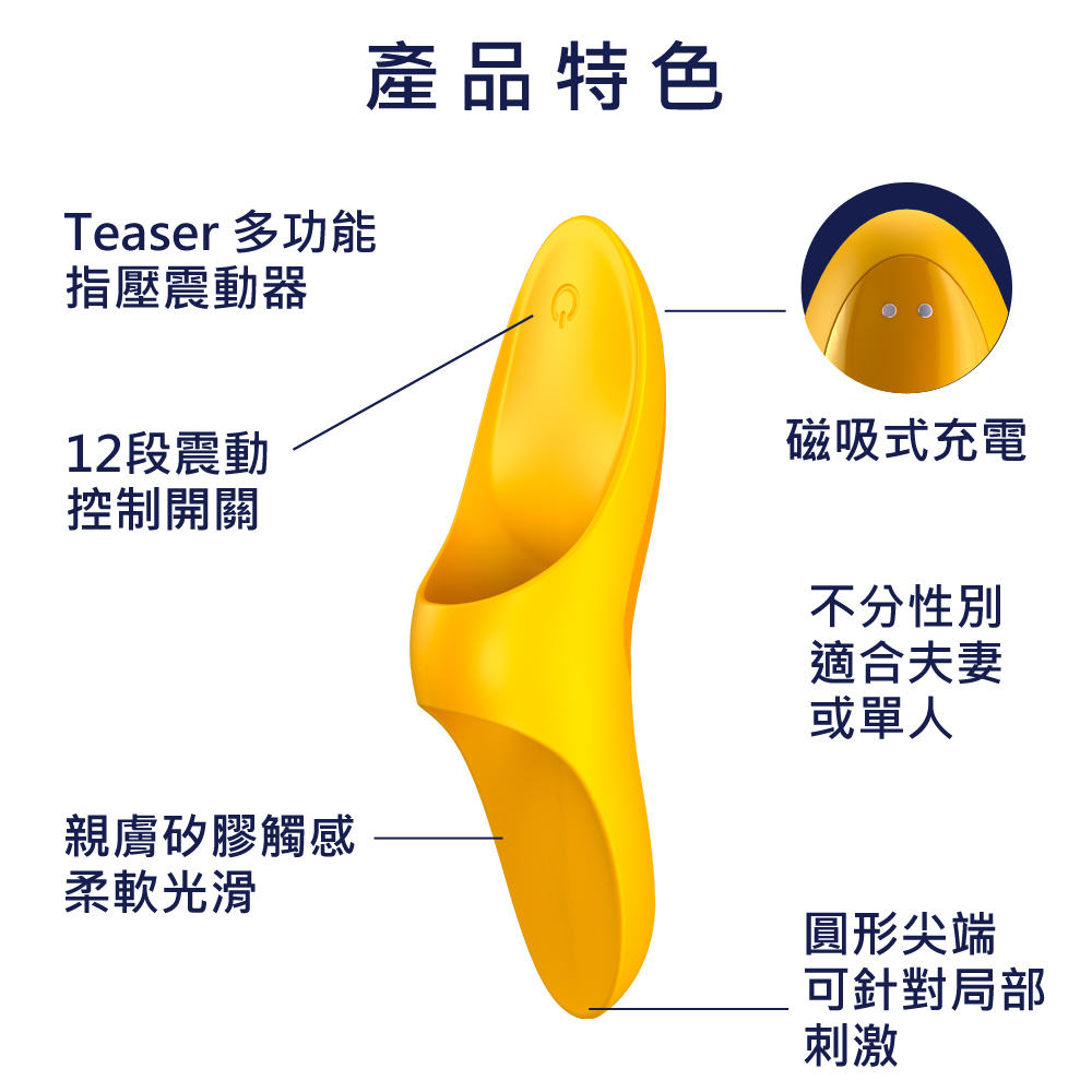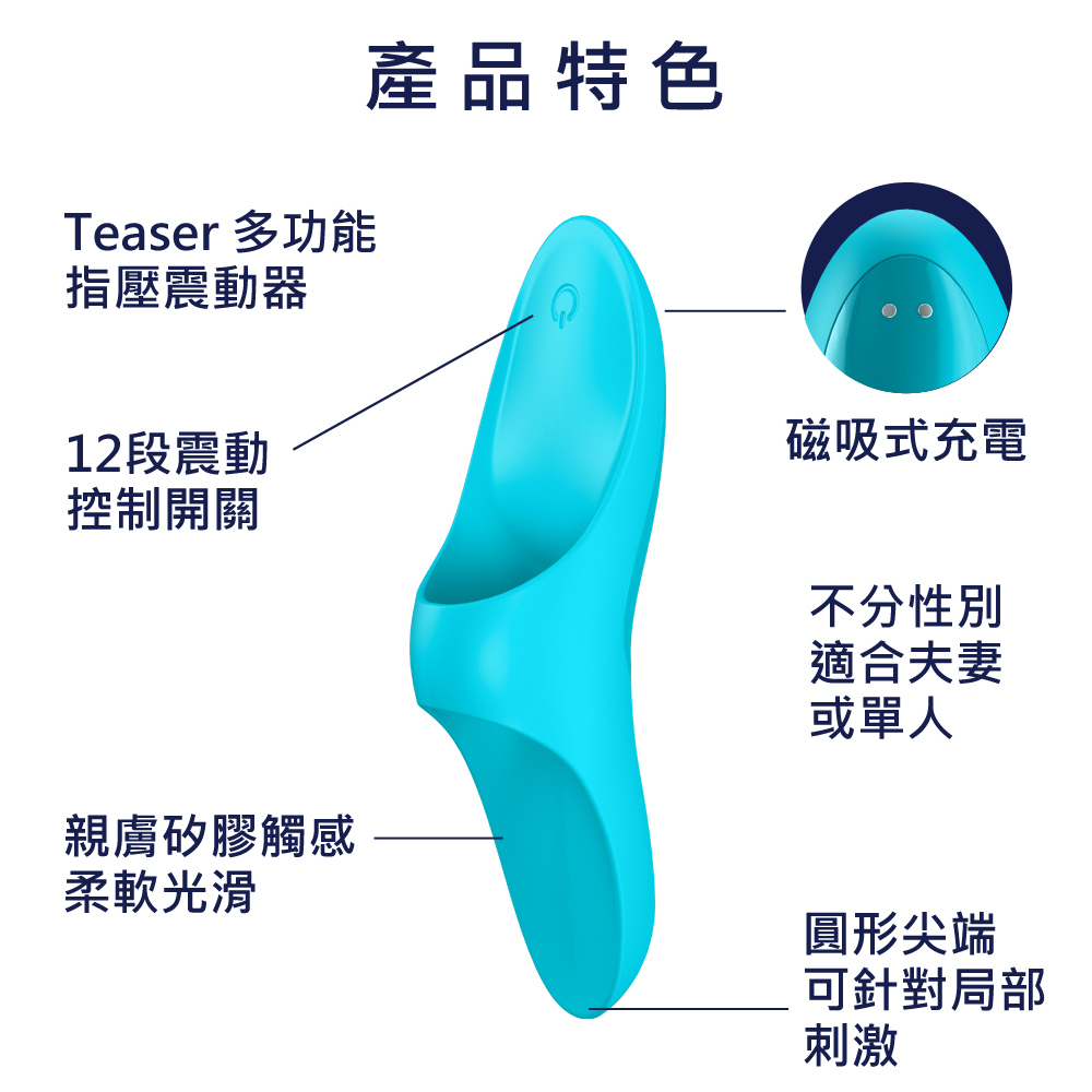 前戲在一段性體驗裡,有著莫大的影響,人的敏感帶非常多,性器官之外還有敏感的耳垂、脖子、大腿、臀部,前戲也是一種取悅心理的方式,TEASER多功能指壓震動器即是為此而生的玩具,幫助你提升在愛撫或是挑逗,增加更多性快感,當然也包含性器官的刺激。TEASER只需穿戴在手指上,就能在前戲過程中的強化挑逗,也能用來刺激陰蒂與乳頭,帶來酥麻的震動感與愉悅。