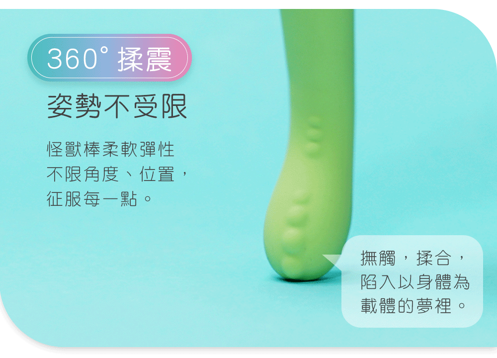 怪獸棒的前緣柔軟彈性,可以360揉轉,姿勢不設限,不限角度,征服你的每一個點,隨意在你的神聖的私處內扭動,綻放怪獸棒的能量,如同手指一般,想像震動的手指在你飢渴的聖杯裡,按觸每一塊神經,加上一點潤滑液,將怪獸棒的震動傳達到你的敏感神經裡,如果你還在尋找你的甜蜜點,怪獸棒可以幫助你在私處中探索。