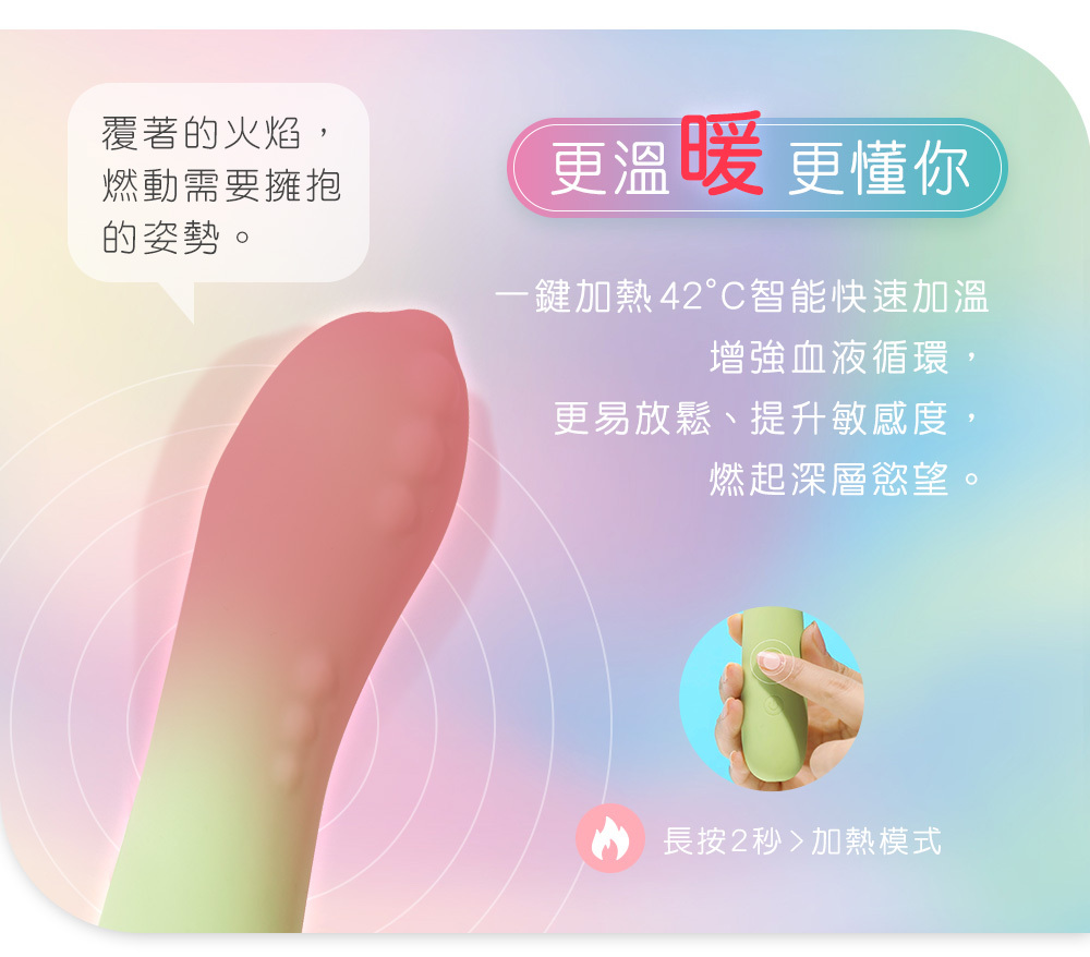 一鍵加熱到42度,智能增溫加速血液循環,更容易放鬆,也更提升敏感度。冷冰冰的物體是多數女性抗拒放入陰道內的原因,但僅僅只是個暖感,就可以讓你體會激情的火焰在陰道內的感受,智能加溫的怪獸棒,不會讓你感到灼熱。躺在床上,播放一部喜歡的電影,將你恣意的想像投入在這有溫度的玩意上,你會理解原來我們的身體多需要那點溫度,按下火焰鍵,長壓兩秒,快來感受加溫後的怪獸棒,燃起你深層慾望。