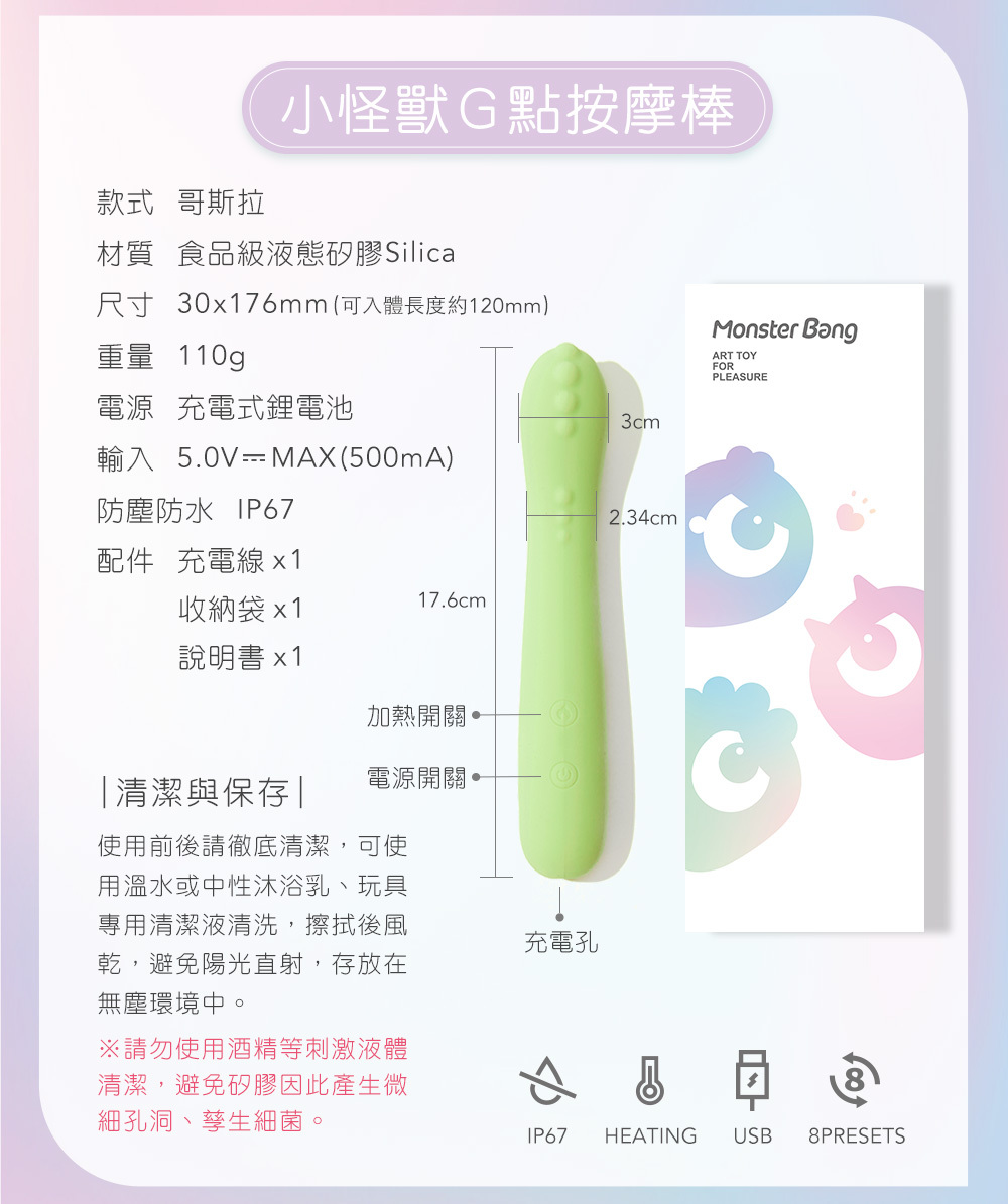 完美的彎曲(比你的男人更好處碰到你的敏感帶)重點是一手掌握,方便攜帶,不具有男性陽具特徵,但卻能滿足陽具所能給的。怪獸棒前緣的是柔軟的食用級矽膠,而不是硬梆梆的觸感,絲滑柔順,在被刺激之時也還能感受到類膚的觸感,怪獸棒的尺寸將不會讓放入私處成為問題,誰說要塞得滿滿才能獲得快感,怪獸棒讓初學者,也能體會完美的滿足感。